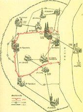 rund um die alte römische Stadtmauer (im Plan rot markiert) in einem weiten Bogen